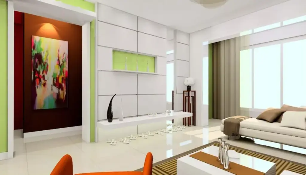 A big factor in your colour choice should be the wall décor itself. For example, a mounted bookshelf (or a tall standing one) will be filled with colourful book covers and decorations, so a solid-coloured neutral wall works. Similarly, paintings and other hanging decorations will need to match the wall behind them.